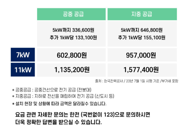 전기차 충전기 설치 부담금은 전력양에 따라 달라질 수 있는데 오늘 설명 드리는 완속 충전기(7kW)의 경우 기존 설비 용량이 충분하다면 추가 부담금이 없고 추가 증설을 하게 되면 발생한다고 이해하면 됩니다. 필요에 따라 60만원 ~ 96만원이 발생할 수 있으니 참고하세요.