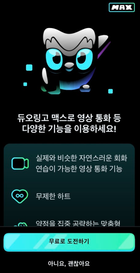 듀오링고를 오랫동안 사용해본 결과, 우선 무료 요금제로 사용해 보세요. 본인 공부 스타일에 맞는 어플인지 아닌지를 체험해보고 유료 요금제로 전환해도 늦지 않습니다. 그리고 맥스는 굳이 추천하지 않습니다. AI 영상통화나 대화하는 것은 오히려 챗지피티가 나은 것 같더라고요. 특히 듀오링고는 하루 10분, 20분 짬나는데로 공부하는데 좋은 어플이기 때문에 장시간 공부를 해야되는 분들에게는 글쎄요 그렇게 추천하지는 않습니다.