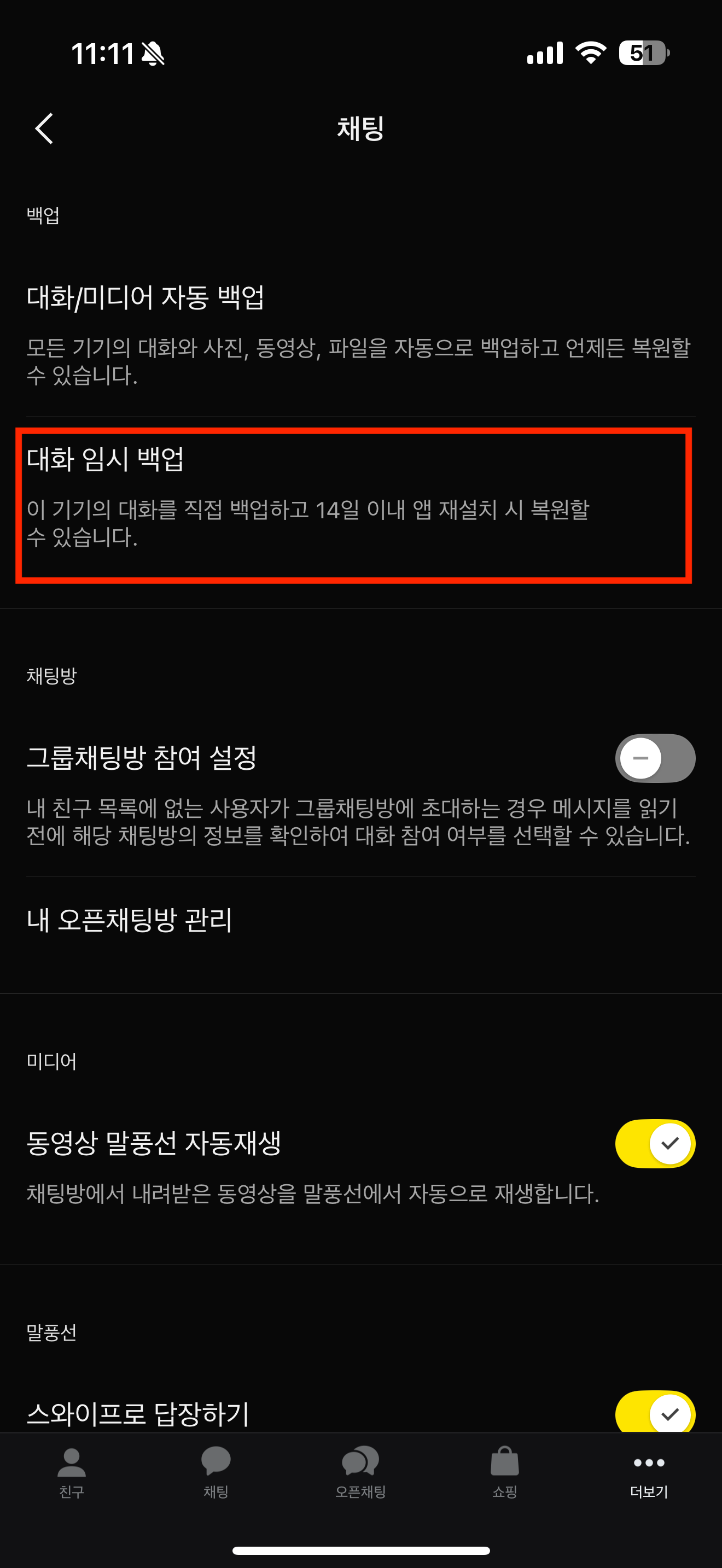 - 대화/미디어 자동 백업