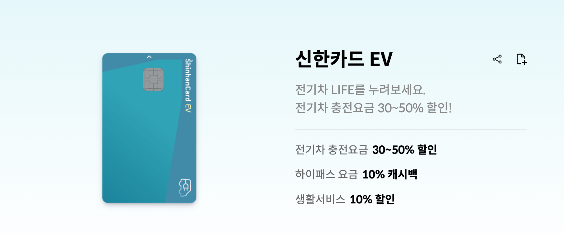 1 신한카드 EV 50% / 월 3만 원 환경부, 차지비, 한전 EV 1.5만 원 30만 원 신청하기