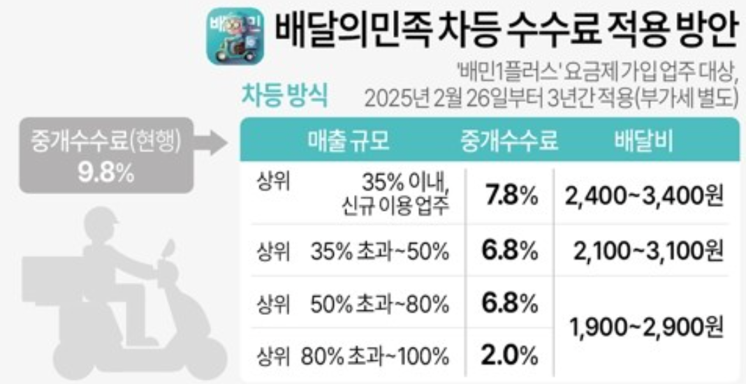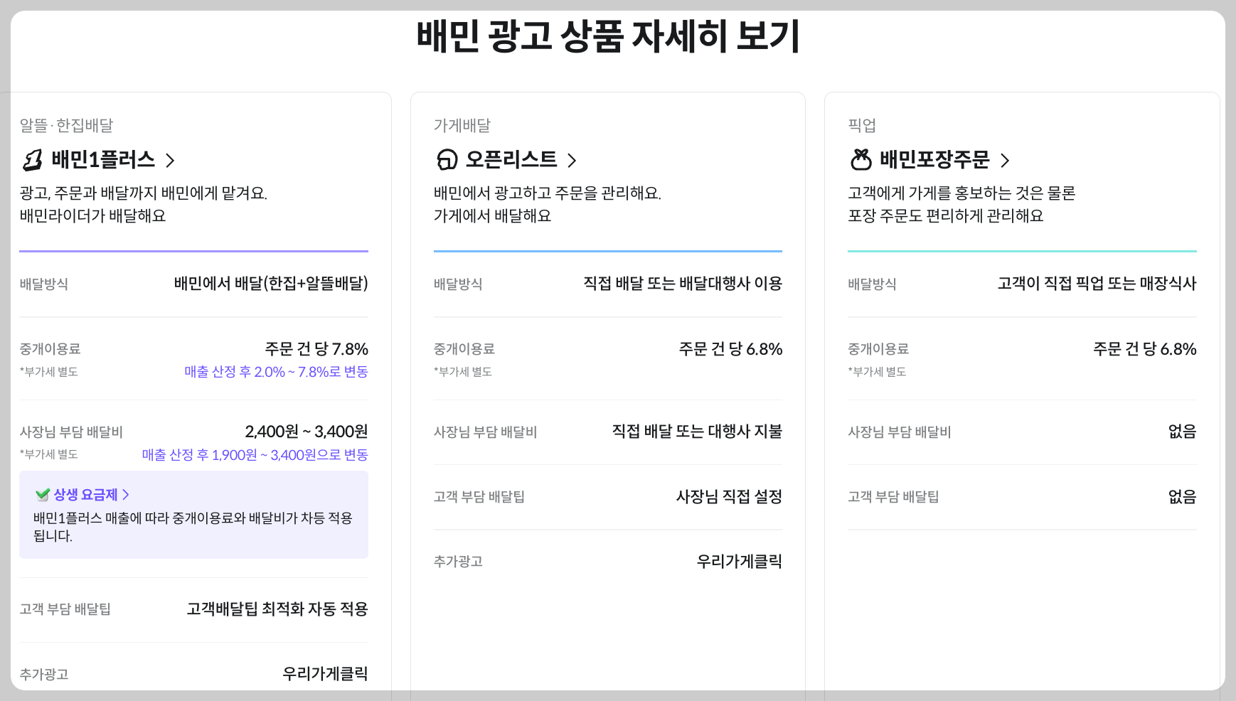 - 배민1플러스(배달 중개): 중개이용료 2.0%~7.8% (구간별 차등) + 업주 부담 배달비 1,900~3,400원 (부가세 별도)