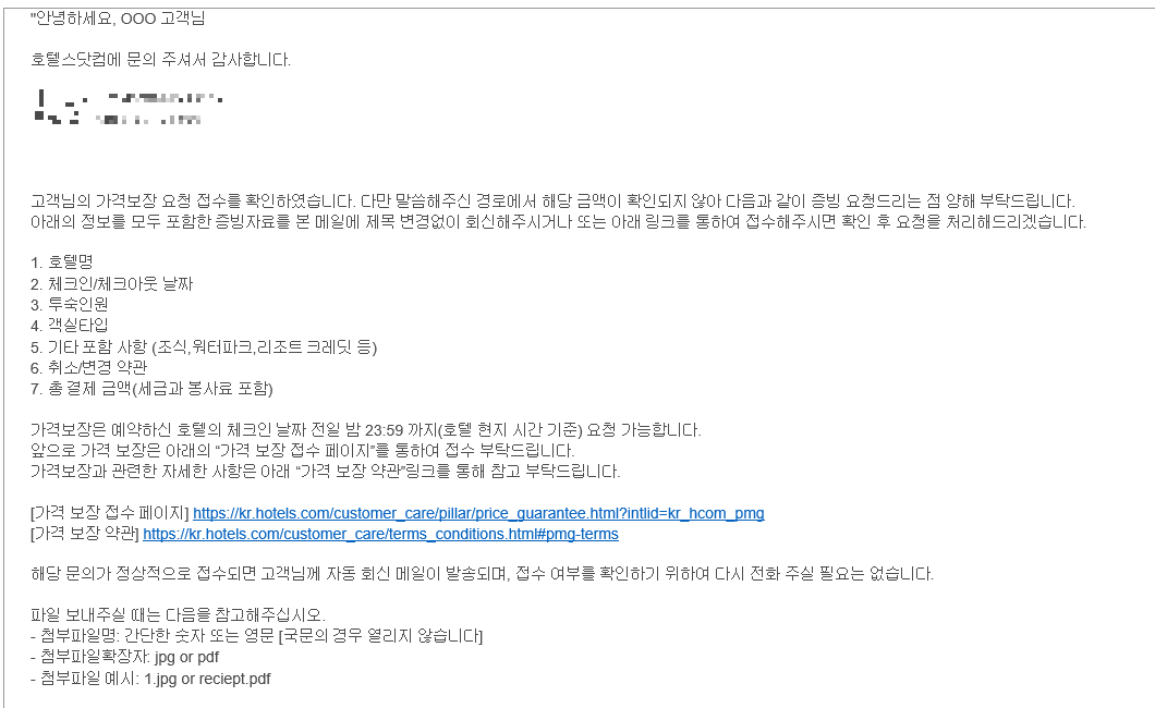 호텔스닷컴을 포함한 호텔 예약사이트에 상담사들은 생각보다 중국인(혹은 조선족)이 많습니다. 통화를 해보면 말투에서 금방 눈치챌 수 있습니다. 대부분 의사소통에 문제가 없지만 다소 어려움이 느껴지면 이메일으로도 접수가 가능합니다. 우선 고객센터에 전화를 해서 상황을 설명하고 본인의 이메일을 알려주면 아래와 같이 관련 정보를 회신하면 됩니다.