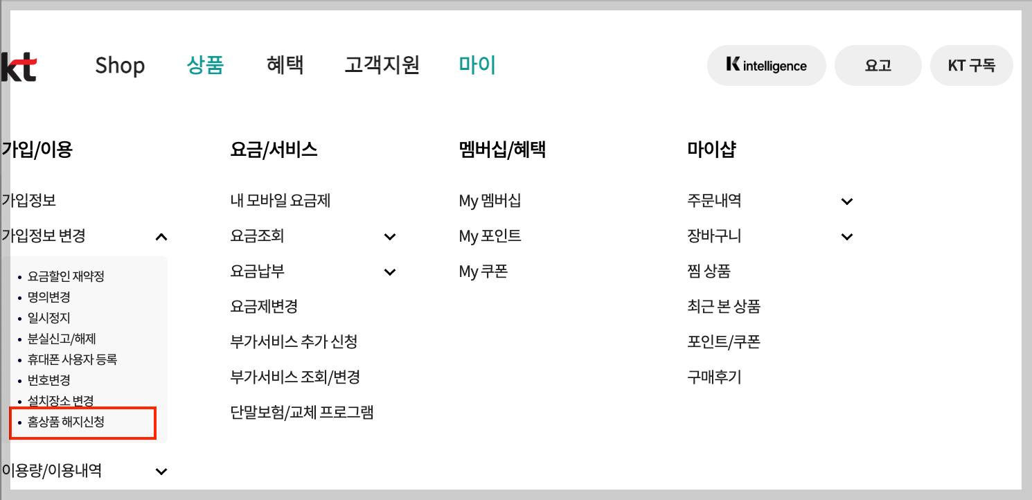 - 상단 메뉴에서 가입/이용 → 가입정보 변경 → 홈상품 해지신청 선택
