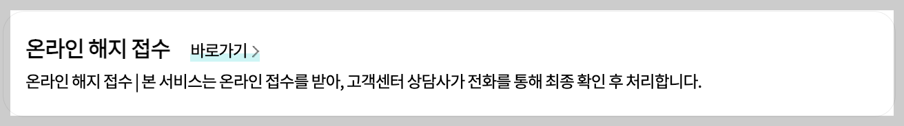 온라인 해지 접수 바로가기 온라인 해지 접수 | 본 서비스는 온라인 접수를 받아, 고객센터 상담사가 전화를 통해 최종 확인 후 처리합니다.