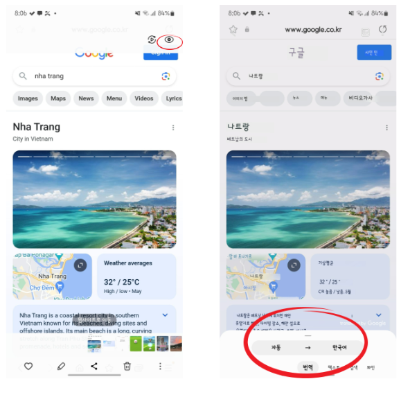 사진이나 화면을 캡처하시고 오른쪽 상단에 있는 눈처럼 생긴 버튼을 누르면 번역됩니다.