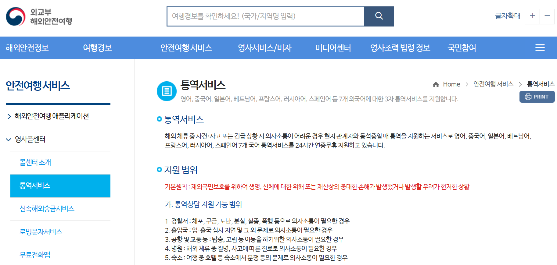 안전한 여행을 위해서 영사관에서 통역 서비스를 지원하고 있습니다. 난처하거나 곤경에 빠져 있다면 영사관으로 전화하셔서 번역 지원 서비스를 받을 수 있습니다. 심각한 문제로 본인이 해결하기 어려운 경우에는 영사관의 도움을 받으면 보다 빠르게 문제 해결을 할 수 있습니다. 통역 지원 범위를 보게 되면 경찰서, 출입국, 공항 및 교통문제, 병원, 숙소와 같이 개인 신변에 중대한 문제가 있는 경우에 도움을 받을 수 있으니 혹시 곤란한 경우에는 곧바로 영사관으로 전화하시면 됩니다. 단, 지극시 개인적인 업무는 지원이 불가능하니 반드시 필요한 경우만 지원 요청하면 좋겠습니다.