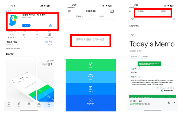가장 대표적인 번역 어플은 네이버 파파고 구글 번역기입니다. 두 어플 모두 앱스토어(아이폰), 구글 플레이(갤럭시)에서 다운로드 가능합니다. 구글 번역기 지원하는 언어가 다양하고 예전부터 서비스를 지원하고 있었기 때문에 번역의 정도가 높고 지원하는 언어가 많습니다.