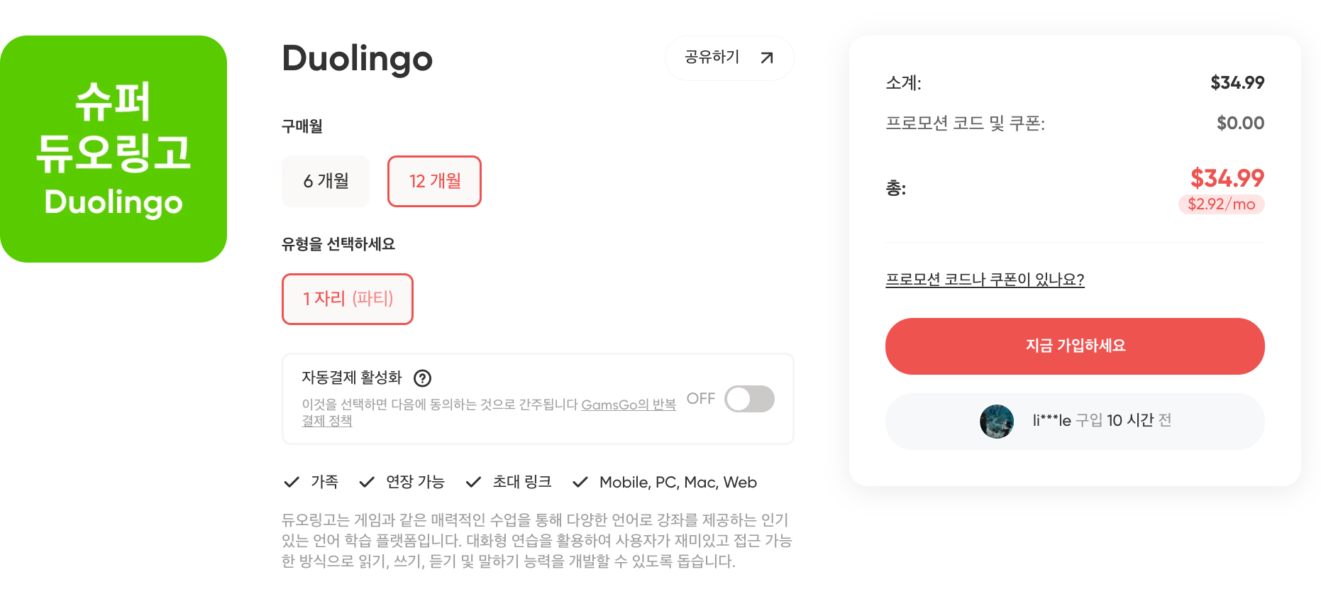 정가로 결제하면 부담이 될 수 있는데, 겜스고(GamesGo) 같은 플랫폼을 활용하면 더 저렴하게 이용할 수 있습니다. 넷플릭스, 유튜브 프리미엄처럼 듀오링고 플러스도 공동 구매 방식으로 판매되는데, 정가 대비 30~50% 저렴합니다.