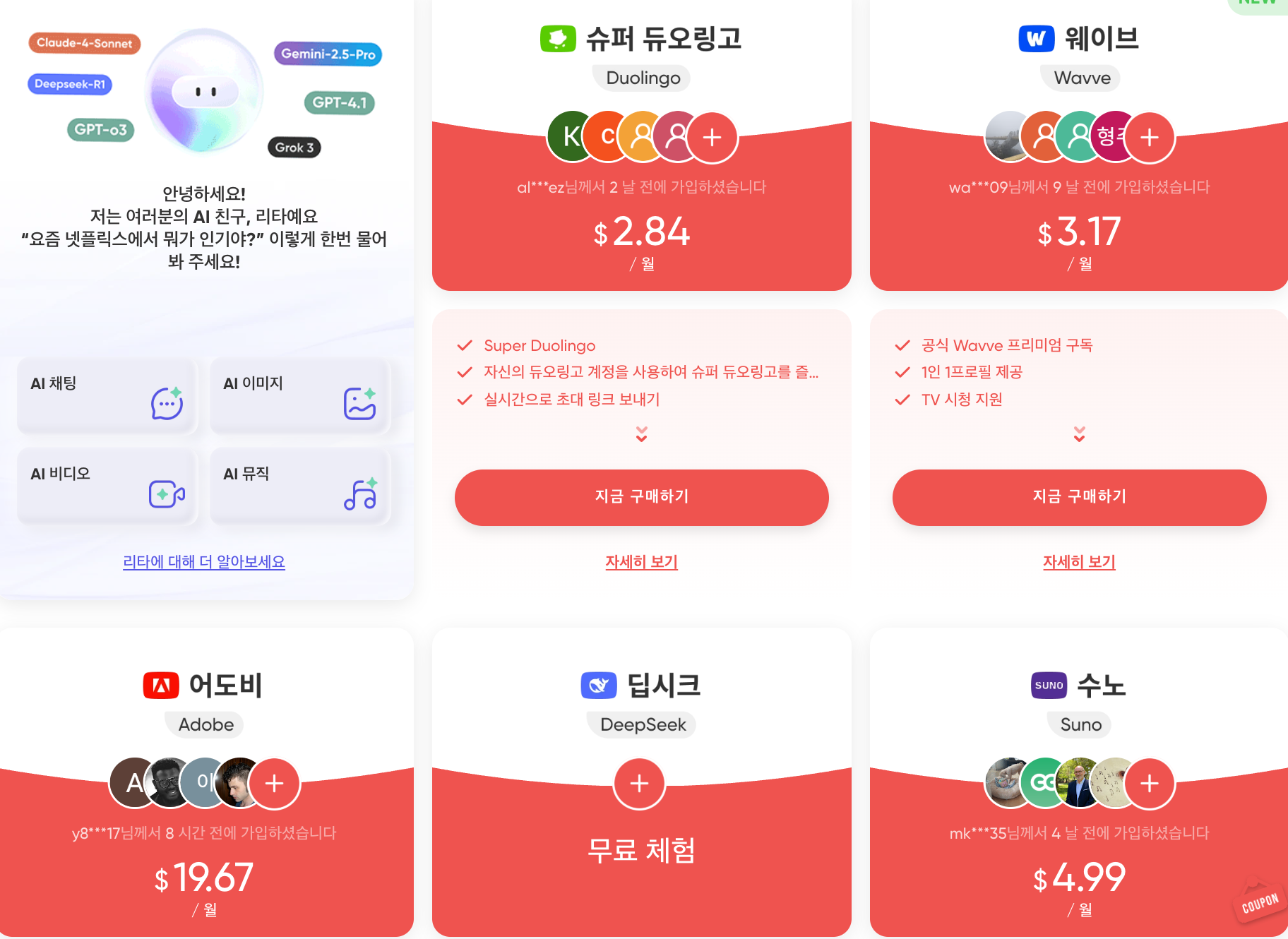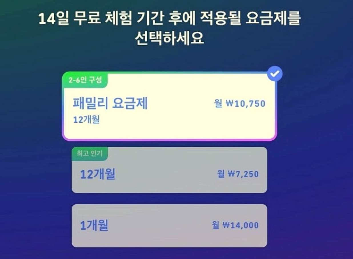 • 패밀리 요금제: 월 14,000원 혹은 연간 129,000원(최대 6명 공유 가능)