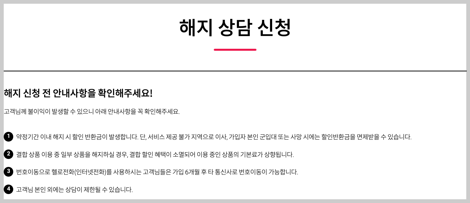 - 웹사이트 해지: 접수 가능하지만 상담원 확인 전화가 반드시 옴.