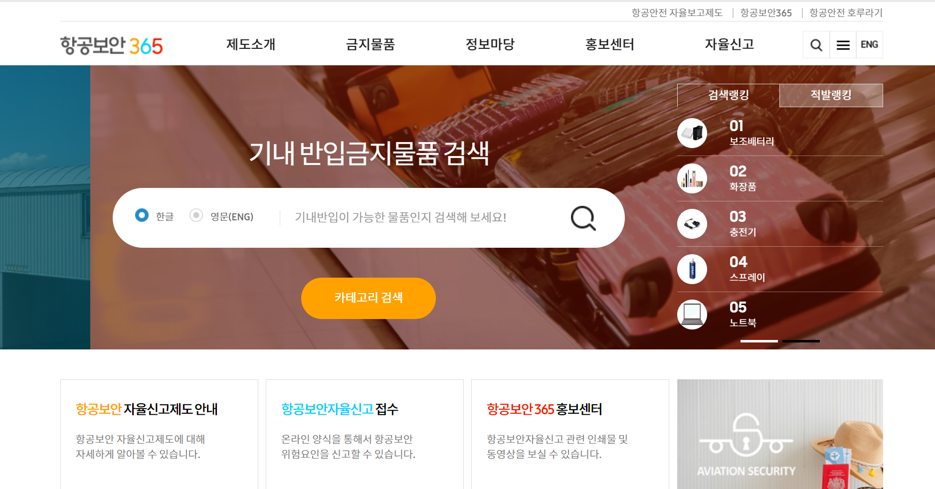 오늘 포스팅을 보셨는데도 헷갈리는 사항이 있다면 항공보안 365에서 모든 정보를 확인할 수 있습니다. 가장 최신 정보를 반영하기 때문에 어떤 사이트보다 정확하다고 말할 수 있습니다. 검색 랭킹을 보시면 보조배터리, 화장품, 충전기가 TOP3인데 오늘 포스팅에서 다루었던 내용이기 때문에 대부분의 궁금증은 해결되었을 것이라고 생각합니다.