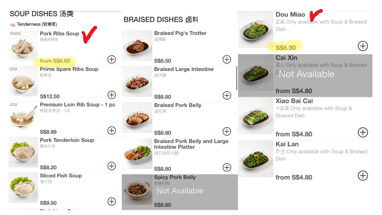 송파 바쿠테에 입장하게 되면 주문을 할 수 있는 QR 코드가 찍힌 종이를 주는데, 스마트폰으로 스캔하게 되면 아래의 메뉴를 확인할 수 있습니다. 가장 기본 메뉴인 Pork Ribs Soup이 8.6 싱가폴 달러이니 약 8,200원 정도라고 보시면 됩니다. 가격도 정말 한국의 국밥과 비슷한 수준입니다. 그 외에 공심채 정도만 먹어주면 깔끔한 한 끼가 될 수 있습니다.
