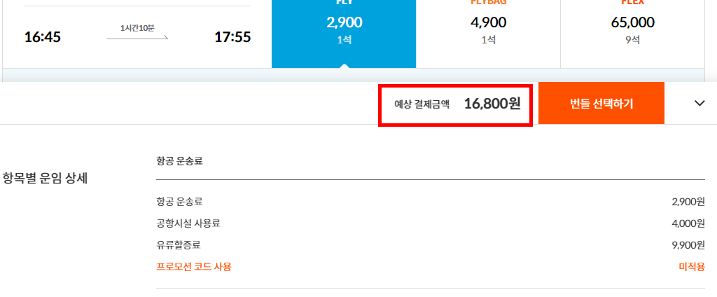 제주항공에서 광고하는 금액은 국내선 항공권 가격이 최저 16,800부터 시작하는데 현재 선택할 수 있는 좌석을 실제로 비교해 보겠습니다. 저는 부산에서 제주행 티켓을 검색했고, 티켓 가격은 2,900원부터 시작하고 공항시설 사용료, 유류할증료가 붙으면 정말 16,800원으로 제주도행 편도 티켓을 발권할 수 있습니다.
