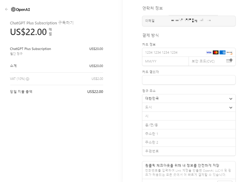 초록색 버튼 Upgrade Plan을 눌러 들어가면 실제 결제창이 뜨는데 부가세(VAT)가 추가되어 총 22 달러 결제가 필요합니다. 오른쪽에 카드 번호와, 유효기간, 보안코드, 주소까지 입력하면 됩니다. 일반 인터넷 결제와 크게 다르지 않습니다.