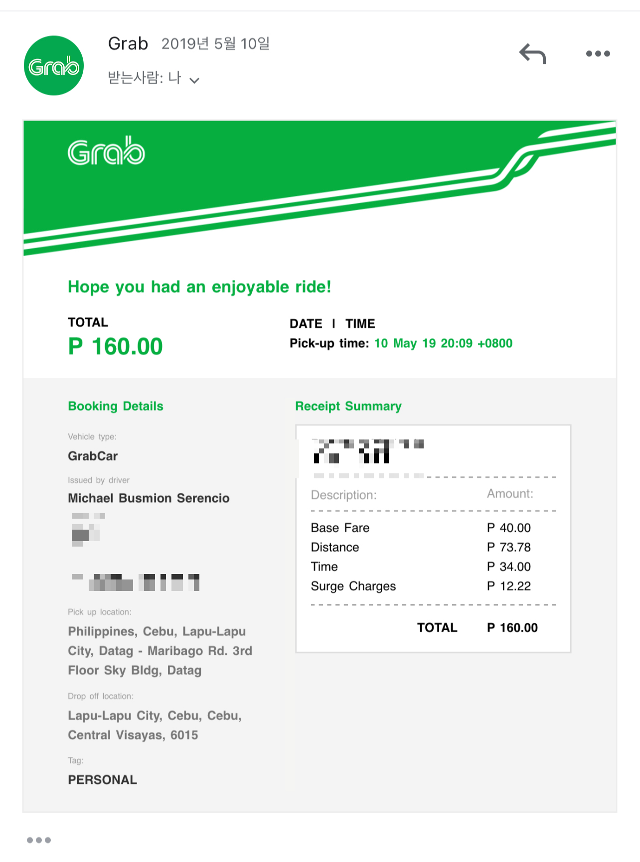 해외 출장을 다니는 분이라면 택시 영수증을 꼭 챙기게 됩니다. 그랩을 사용하면 회원가입했던 이메일로 영수증을 받을 수 있습니다. 출발지 / 도착지 정보까지 포함되어 있으니 여러모로 유용하게 사용할 수 있습니다.