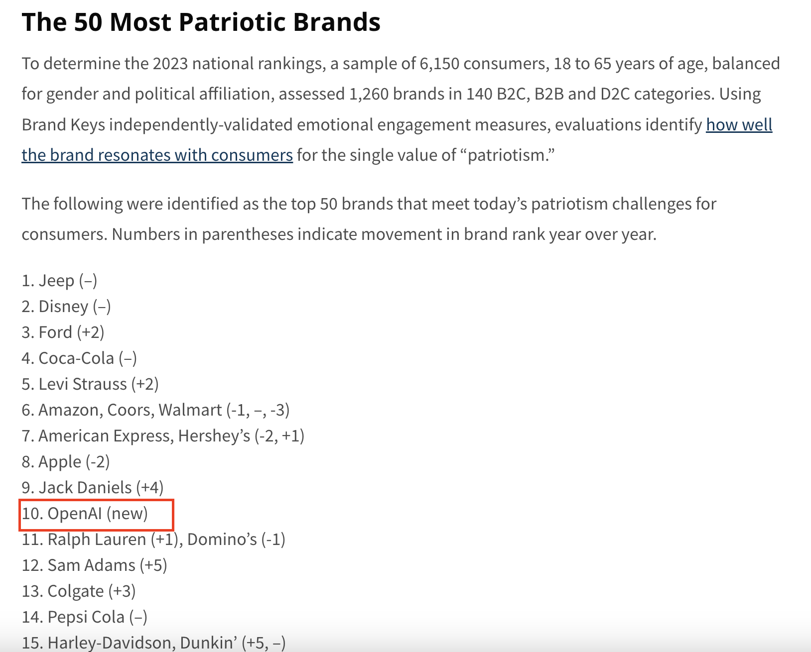 심지어 미국인들이 사랑하는 국민 브랜드 10위에 Open AI가 진입하며 얼마나 챗 지피티가 뜨거운 관심을 가지고 있는지 알 수 있습니다. 랄프로렌, 도미노, 할리데이비슨 등 유명 브랜드를 제 치고 Top 10위까지 순위를 끌어올렸습니다.