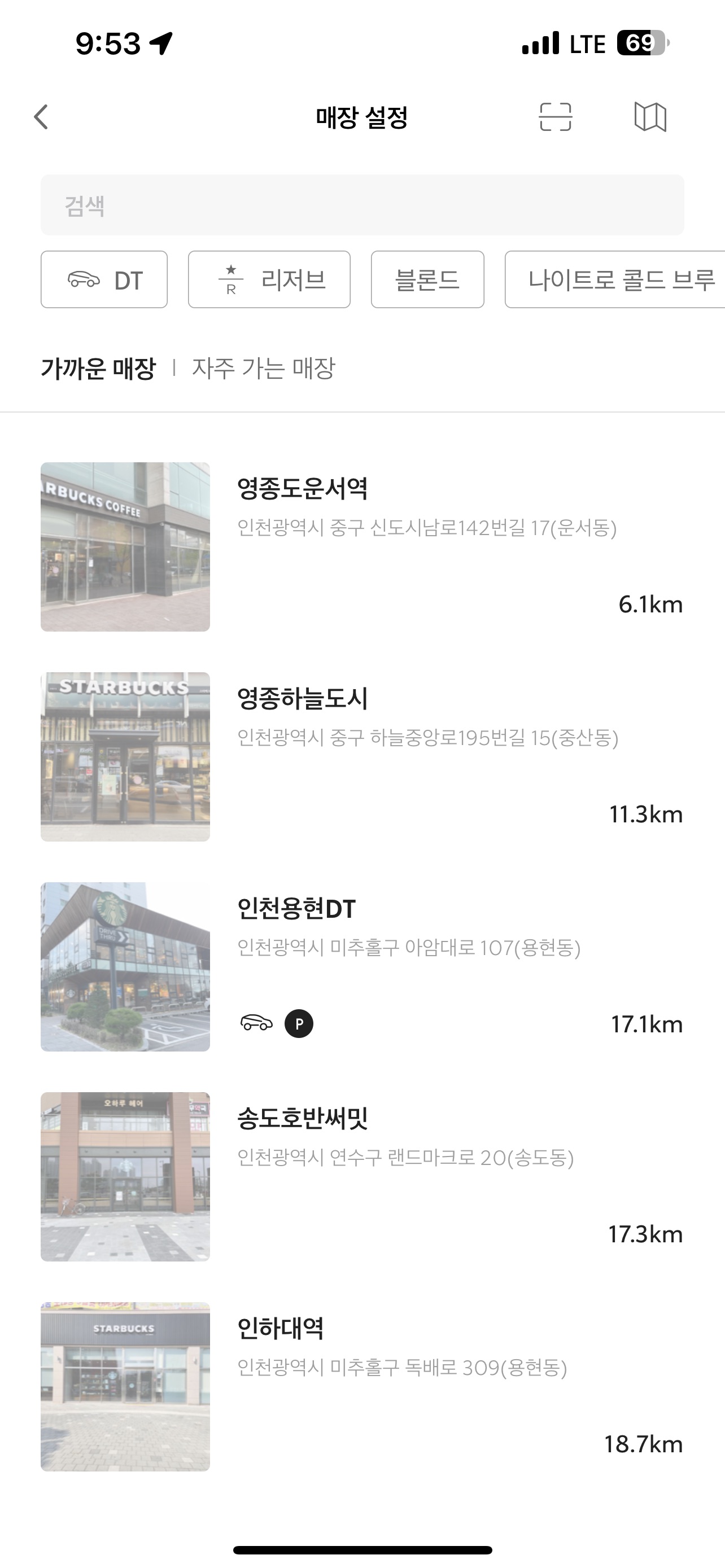 하지만 인천공항에서 아쉽게도 사이렌 오더는 안됩니다. 사이렌 오더를 왜 막아 놓았는지는 모르겠지만 굳이 긴 대기줄을 기다릴 필요가 없을 것 같은데 너무 많은 사람들의 주문이 몰리는 것을 방지한 거 같습니다. 사이렌 오더를 시도하게 되면 아래의 인천에 있는 그나마 가까운 스타벅스가 뜨는데 당연히 멀어서 주문도 안됩니다.