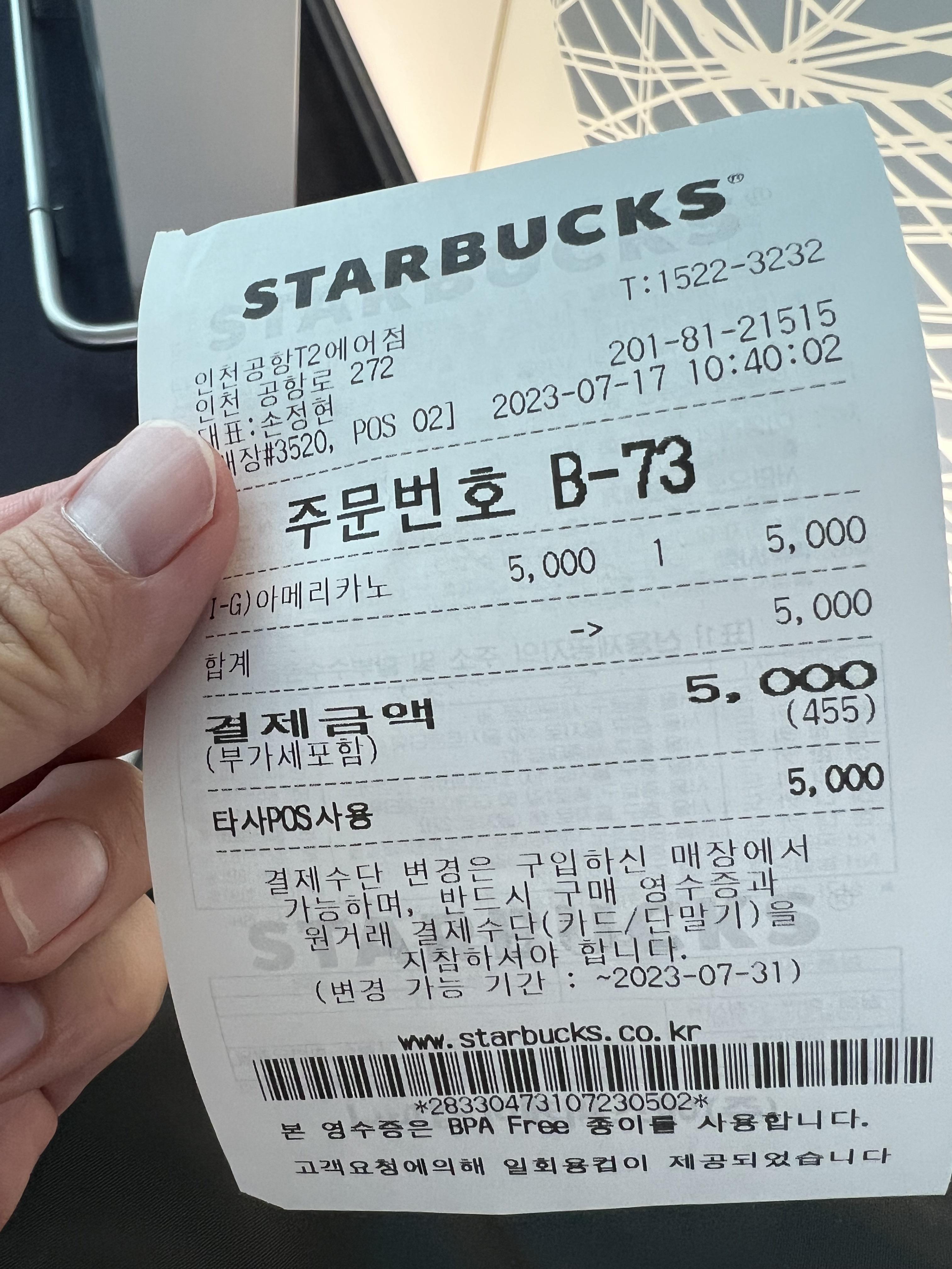 스타벅스에서도 애플페이 사용을 도입했는데요. 스타벅스 인천공항점에서도 동일하게 애플페이로 결제가 가능합니다. 저도 카드를 꺼내도 괜찮은데 굳이 한 번 애플페이를 써보았습니다. 역시 애플페이가 삼성페이보다 결제속도가 빠르긴합니다.