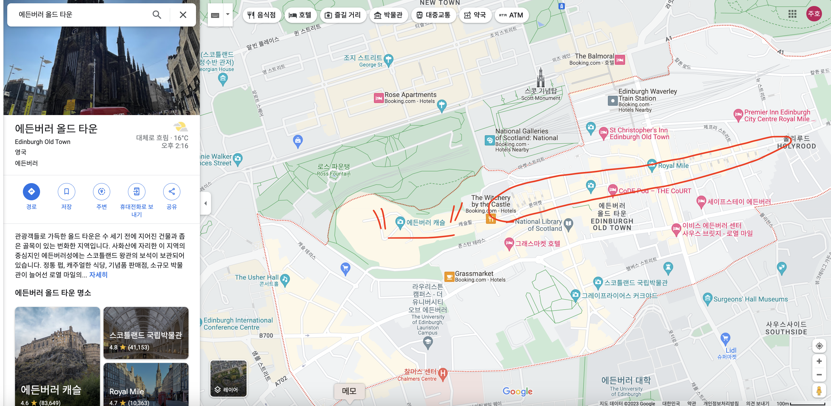 올드타운을 구글 맵으로 검색하면 꽤 범위가 넓게 나옵니다만 제가 앞서 말씀드린 것처럼 에든버러 성 앞쪽 라인이 가장 큰 관광지입니다. 아래 지도로 표시해 드렸듯이 일자로 뻗은 메인 로드를 먼저 구경하시고 구석구석 구경을 한다면 알찬 여행 코스가 될 수 있습니다. 영국이지만 잉글랜드와는 사뭇 다른 분위기를 하고 있어 또 다른 매력을 느낄 수 있습니다.