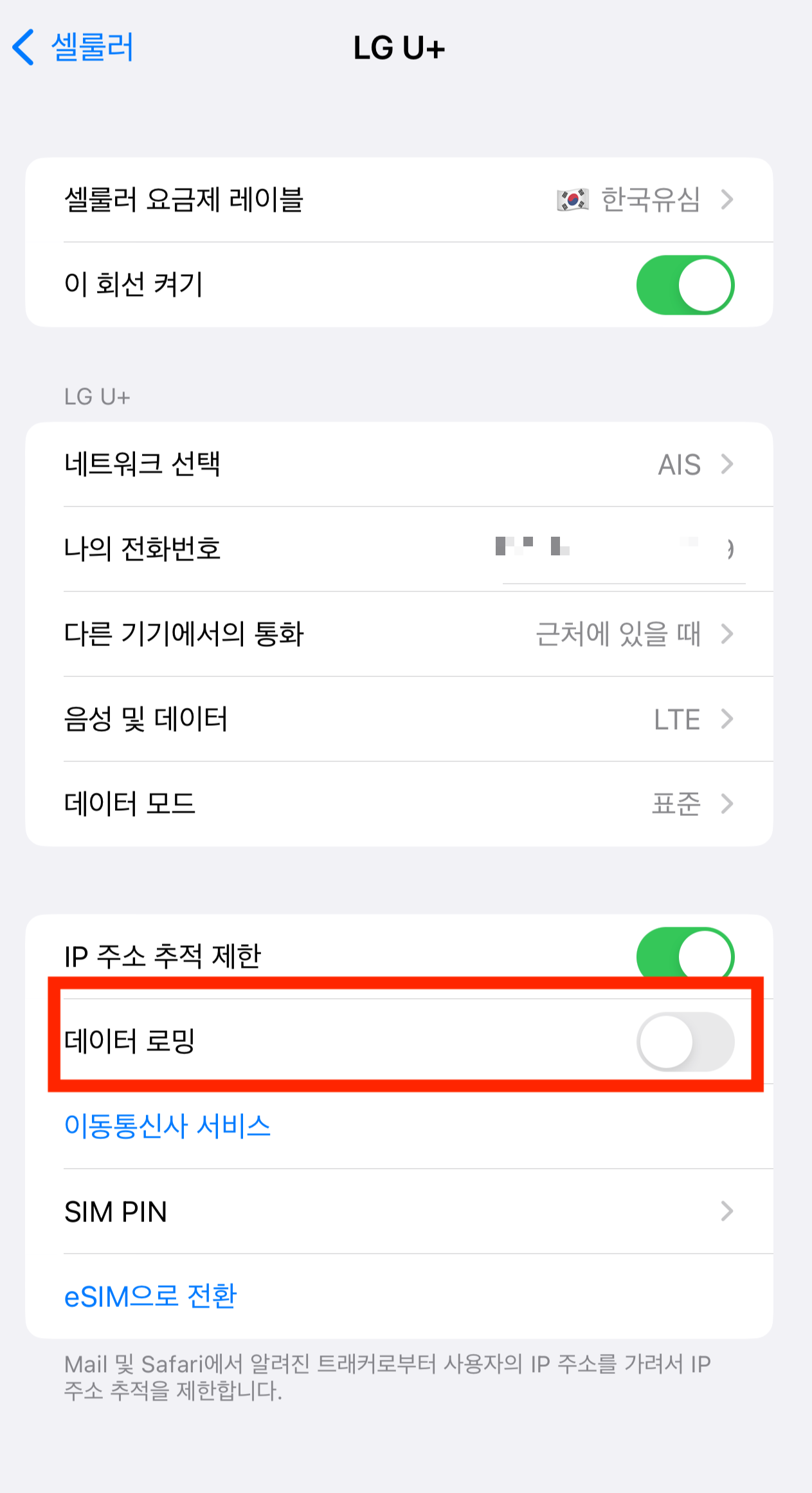 추가로 한국 유심의 데이터 로밍 버튼은 반드시 비활성화시켜 주고, 현지 eSIM의 데이터 로밍 버튼을 활성화시킵니다.