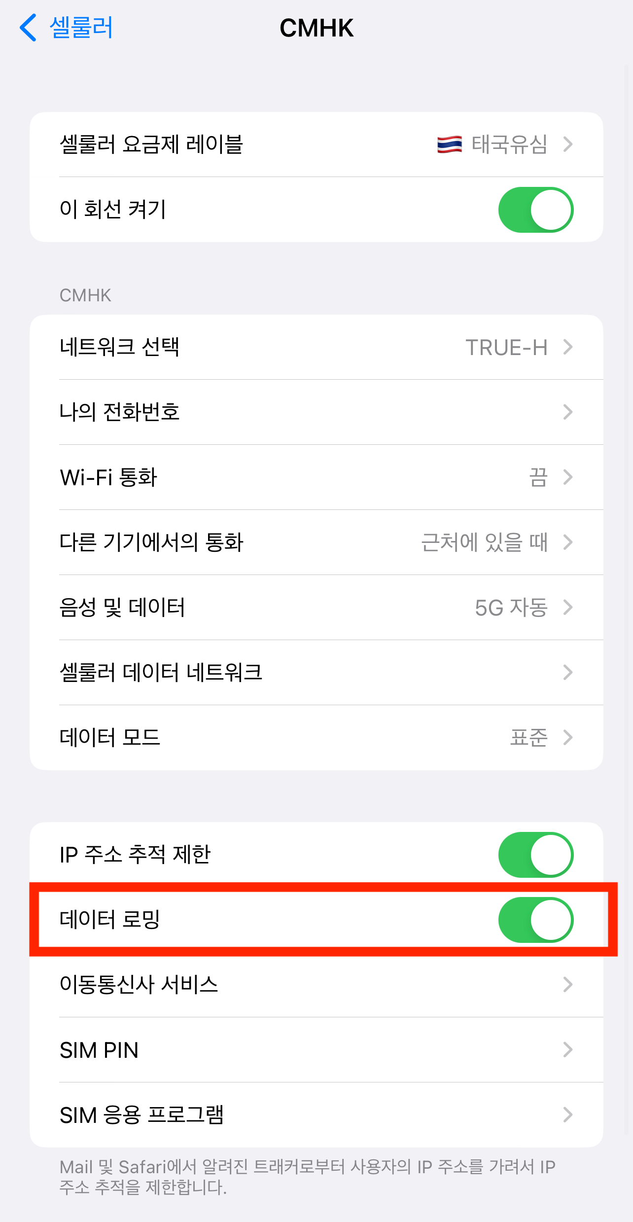 아래 사진을 보게 되면 셀룰러 데이터는 태국 유심(eSIM) , 기본 음성 회선은 (한국 유심)으로 설정한 것을 알 수 있습니다 주의할 점은 셀룰러 데이터 전환 허용 버튼을 비활성화시키는 것입니다. 아니라면 한국 유심에서 데이터를 잡게 될 수도 있는데 로밍 요금이 중복 청구되는 원인입니다.