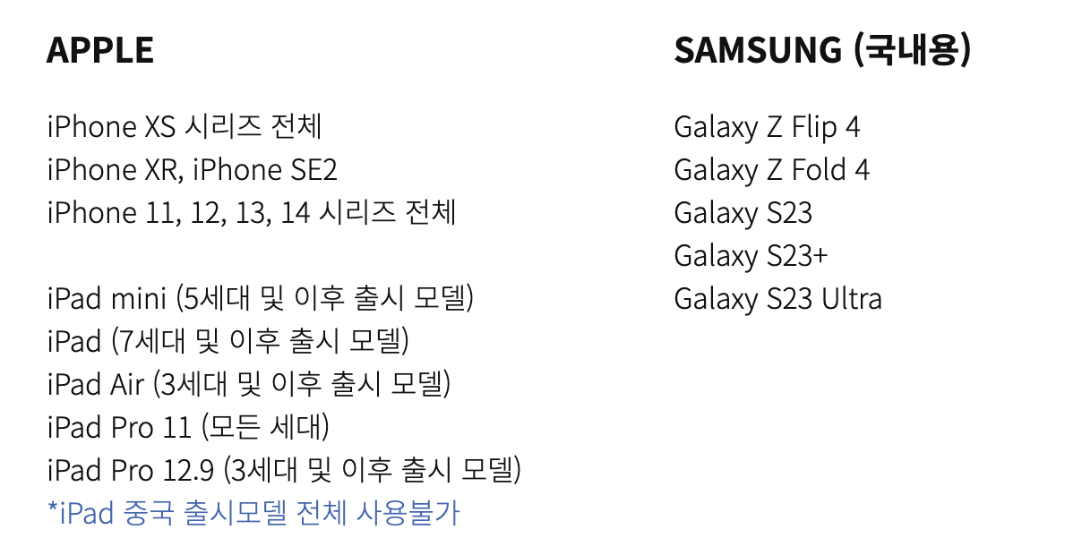 제가 앞선 포스팅에서 eSIM 사용 방법에 대해 상세히 설명드렸지만, 지원 모델에 대해서는 간단하게 아래 사진 참고하시고 등록 방법에 대해서는 기존 포스팅에 잘 정리되어 있으니 아래 링크로 들어가 보시면 됩니다. 애플, 삼성 각각 참고하시고 삼성의 경우 얼마 전 출시된 갤럭시 Z Flip5, Fold 5도 사용할 수 있습니다.