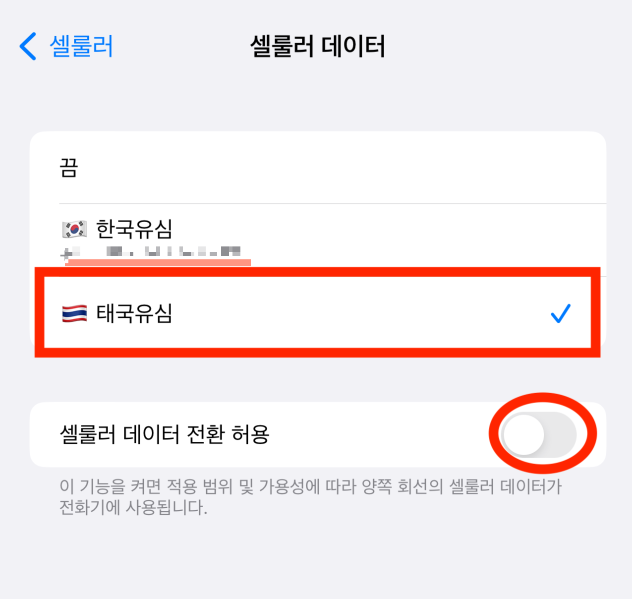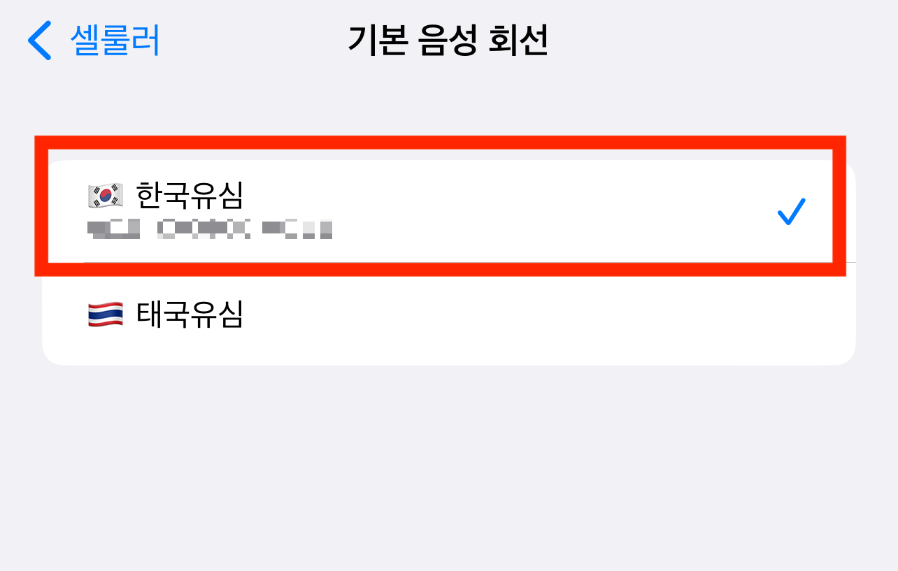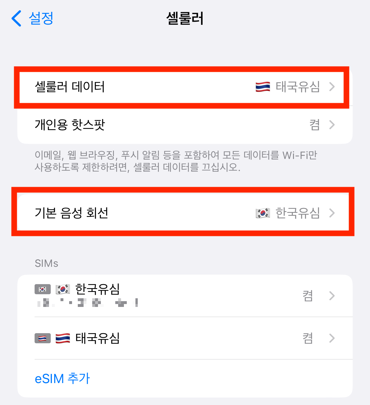 아래 사진을 보게 되면 셀룰러 데이터는 태국 유심(eSIM) , 기본 음성 회선은 (한국 유심)으로 설정한 것을 알 수 있습니다 주의할 점은 셀룰러 데이터 전환 허용 버튼을 비활성화시키는 것입니다. 아니라면 한국 유심에서 데이터를 잡게 될 수도 있는데 로밍 요금이 중복 청구되는 원인입니다.