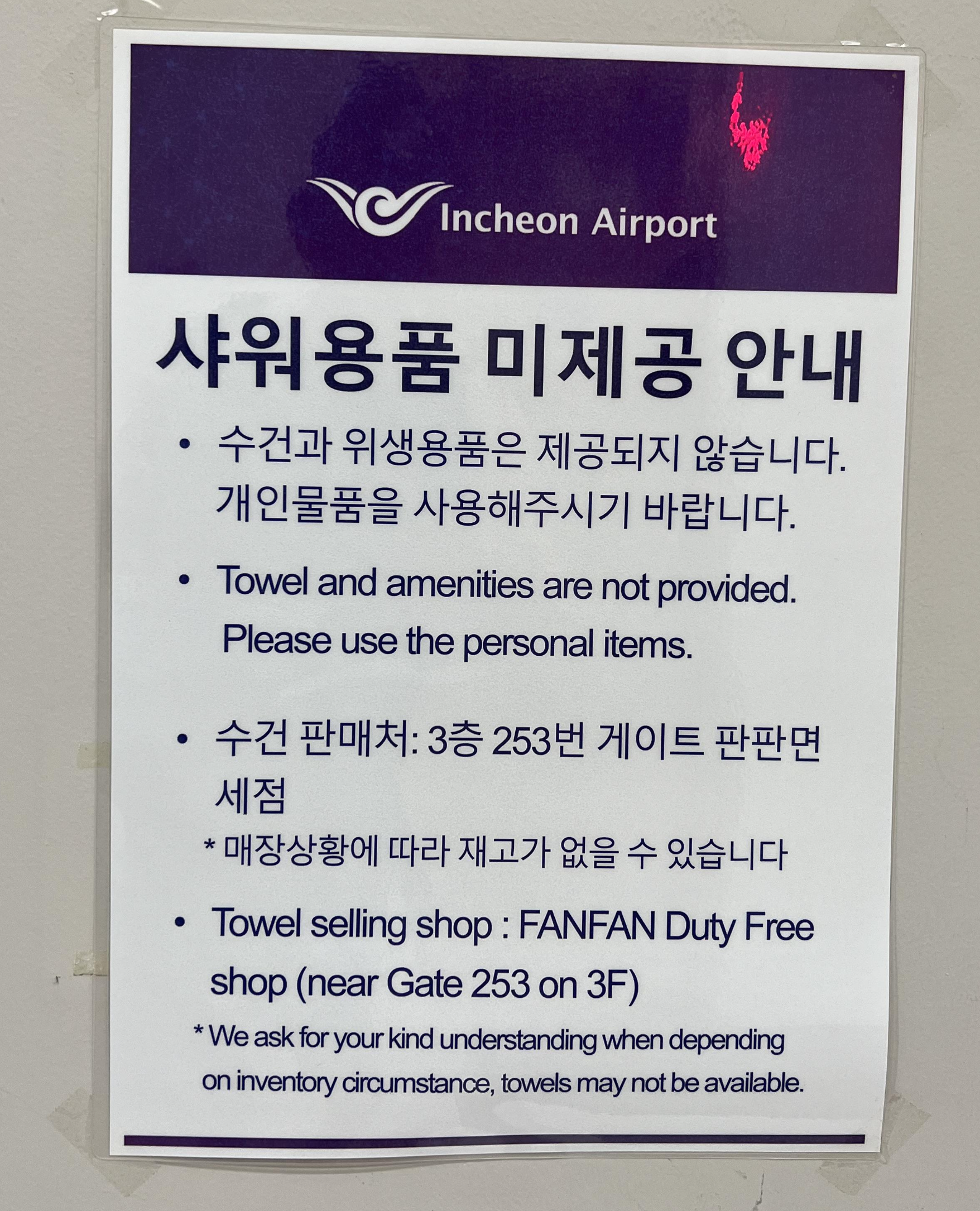 간단한 세면도구나 수건은 지급되지 않습니다. 예전에는 세면용품까지 지급했는데 코로나 이후에는 전면 중단되 었네요. 2 터미널 기준으로 3층 253번 게이트 판판 면세점에서 수건을 살 수 있으니 샤워가 필요한 분은 수건을 구매 한 뒤에 이용하면 되겠습니다.